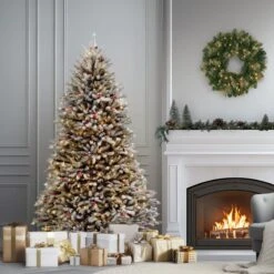 Though tall in height, this Natural Fraser tree offers a slimmer profile which may make it better for display in corners or areas with limited floor space, compared to typical trees of similar height. It is pre-strung with 1000 clear lights that remain lit even if a bulb burns out. This tree features hinged branch construction for ease of assembly. Sturdy metal tree stand is included.