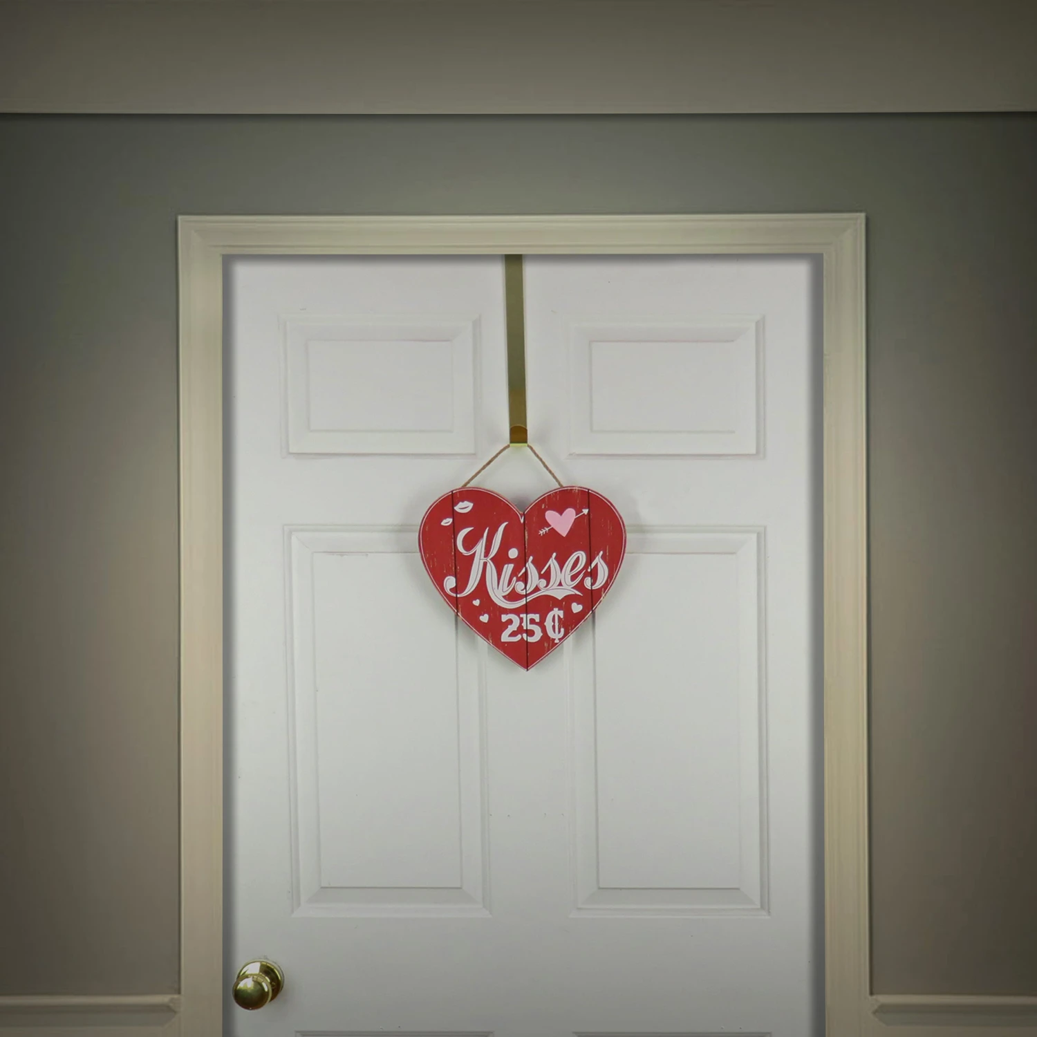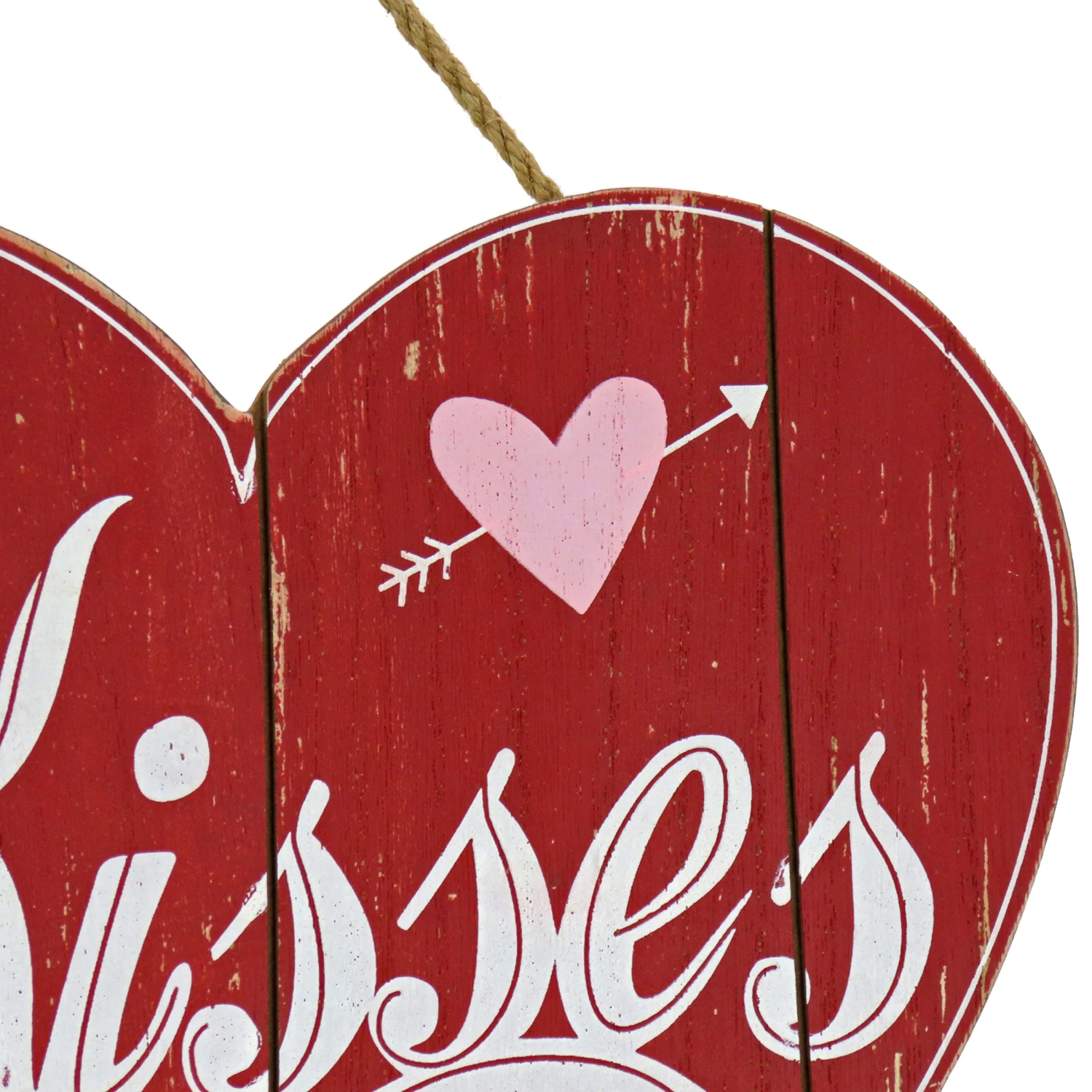 Send the message to pucker-up with this Valentine’s Day themed wall sign. It is constructed of red painted lightweight wood material with slatted wood grain design featuring the message “Kisses” in flowing script letters followed by “25¢” right below. A motif of hearts and lips float around the printed characters. Display this fun decorative piece on door, wall, or window in indoor locations. Includes sisal string loop for hanging.