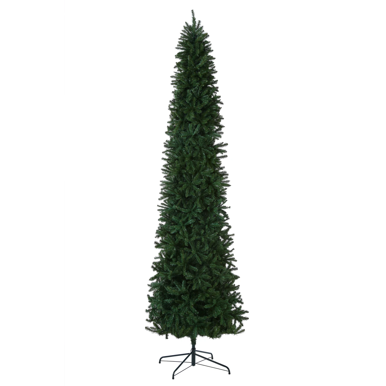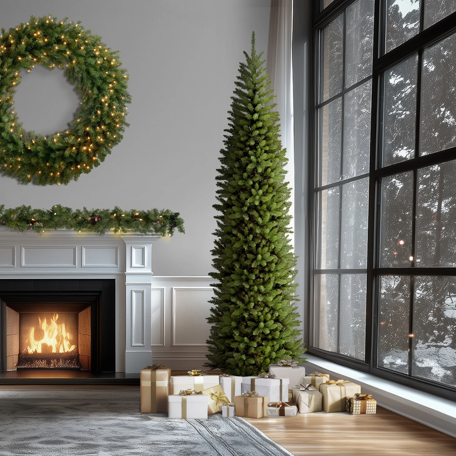 Though tall in height, this Kingswood Fir tree has a pencil thin profile that may make it better for display in corners or areas with limited floor space, compared to typical full width trees of similar height. This tree features hinged branch construction for ease of assembly. Sturdy metal tree stand is included.