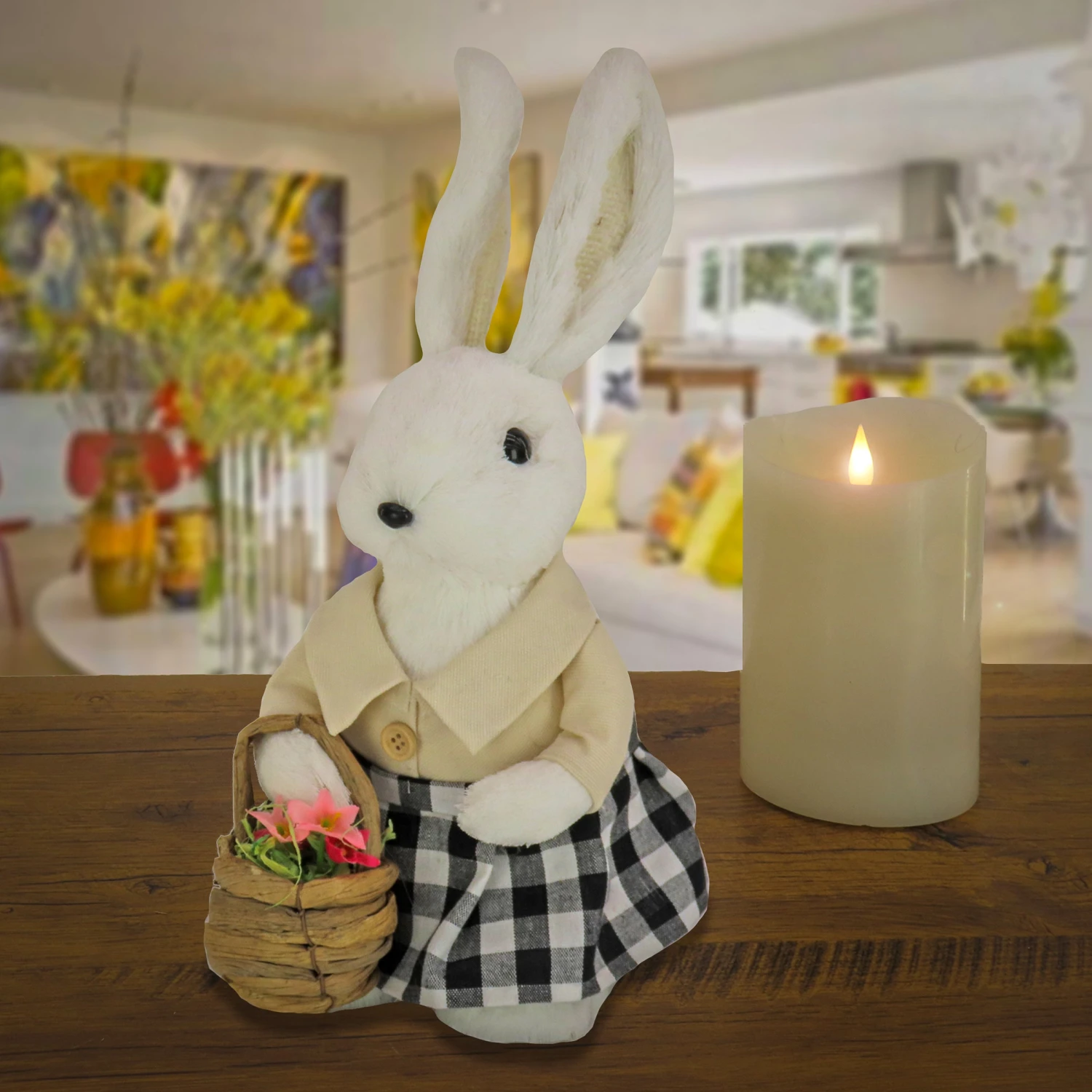 - This adorable table decoration features a female bunny carrying a flower-filled basket and sporting a black and white checkered skirt and beige blouse