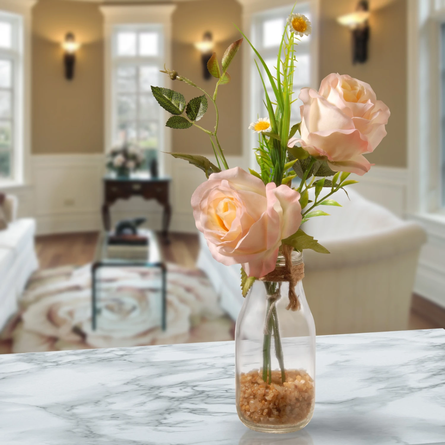 - Includes one Artificial Flower Bouquet in Glass Vase that measures 13 inches in height, is filled with large, peach roses and includes sprigs, leaves and stems in a charming glass vase with a pebble base.