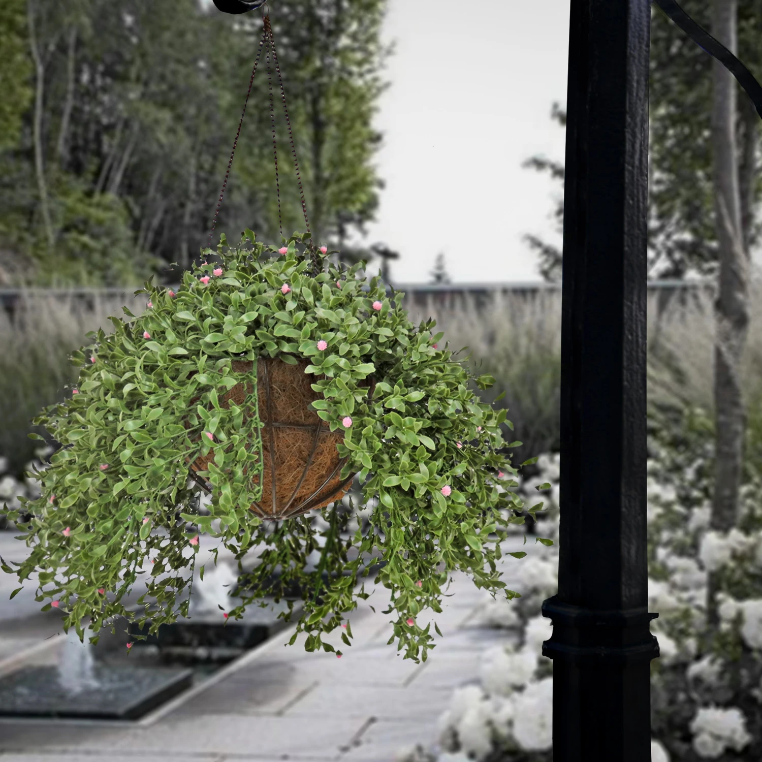 This hanging basket Argentea Plant features a thick cascade of leafy branches sprinkled with pink flower blooms. This artificial greenery looks incredibly real yet requires none of the maintenance of a living plant. Steel wire cage construction with linked chain and hook included. Perfect for porch, patio, or poolside.