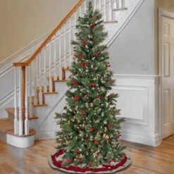 The Perry Hard Needle tree features a mix of snow-dusted evergreen and bristle branch tips and is trimmed with snow dusted pine cones. This is a full body tree featuring a generous number of branch tips for holding holiday trimmings. Crafted with high quality materials and hinged branches for easy set up and includes a sturdy metal folding stand. For indoor display only.