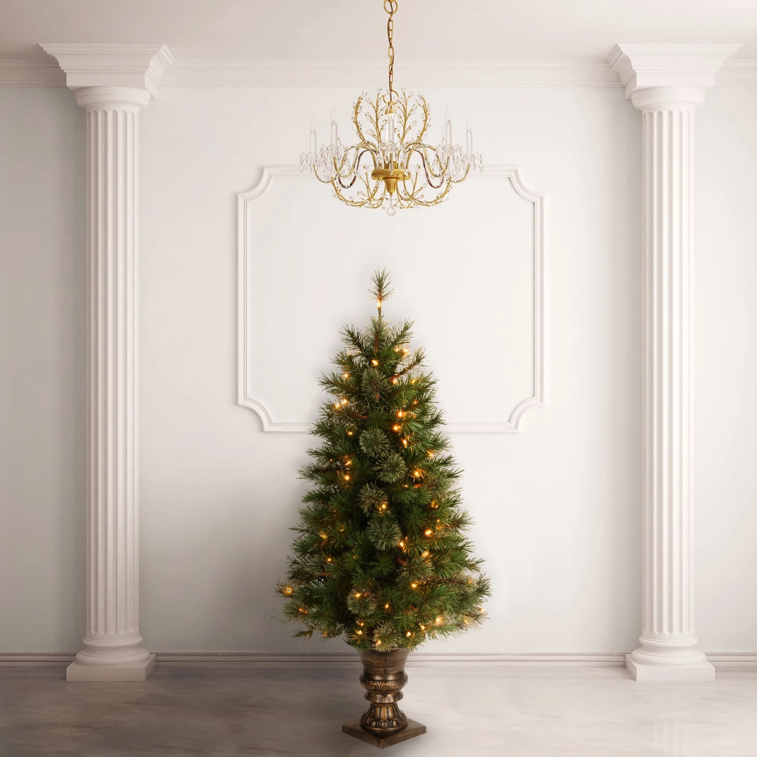 The Atlanta Spruce Entrance tree is a handsome decoration for display in doorways, hallways, porches and patios. It is pre-lit with 100 clear lights that remain lit even if a bulb burns out and is seated in a decorative urn base. This attractive decoration can be displayed indoor or outdoors.