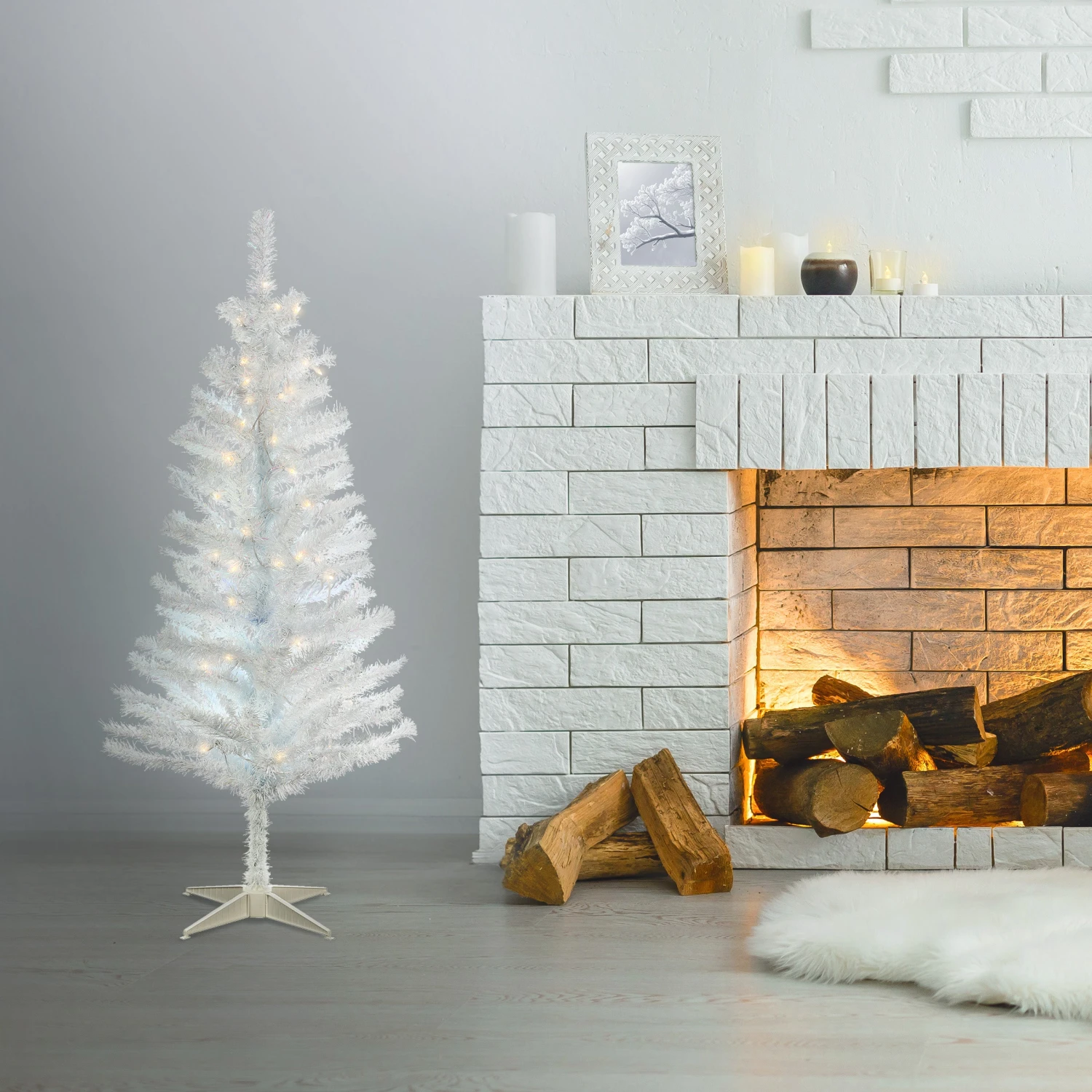When you think of the holiday season, often what comes to mind are tinsel decorations. This 4 ft. white iridescent tinsel tree with matching stand is pre-strung with 70 clear lights that remain lit even if a bulb burns out. The lights sparkle and colorfully shimmer off of the iridescent branch tips. Display this decoration on tabletop or floor for a sparkling addition to your holiday trimmings.