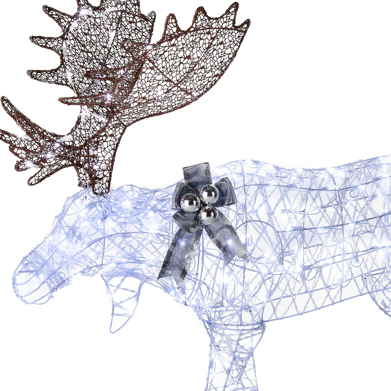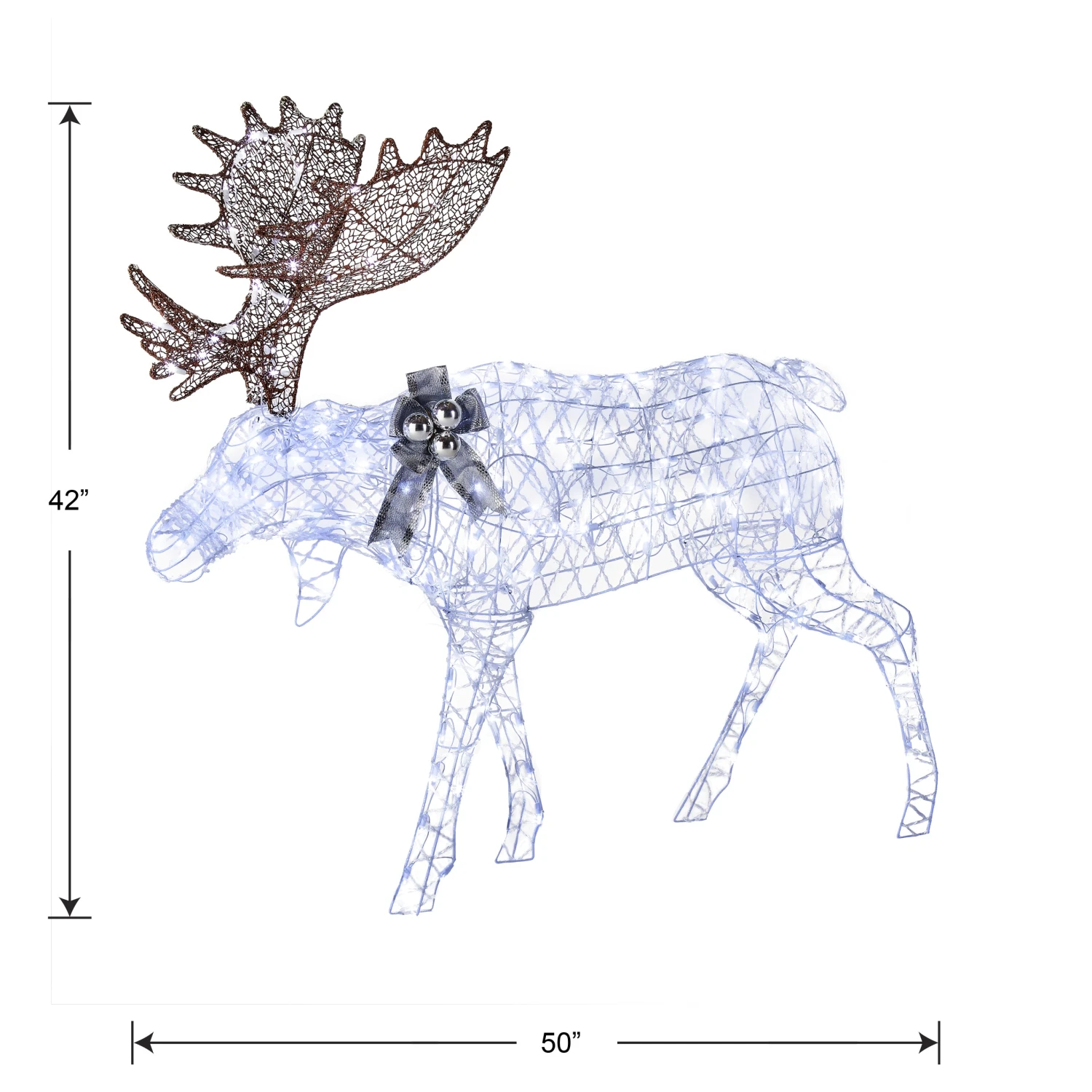 - Includes one 50 inches in height white glitter Moose with silver bow and ornaments. To power the lights, simply plug in to the nearest wall outlet