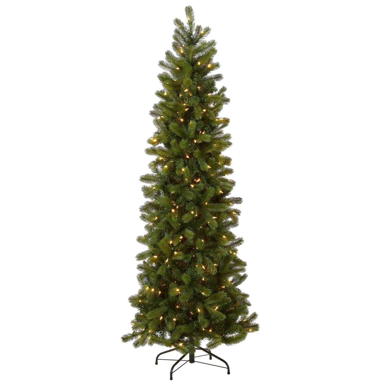 - This Downswept Douglas Fir Slim Pre-Lit Artificial Green Christmas Tree is 6.5 feet tall with a 30 inch base diameter. Featuring hundreds of Feel Real individually crafted branch tips to create full bodied branches, this tree is designed to look and fee