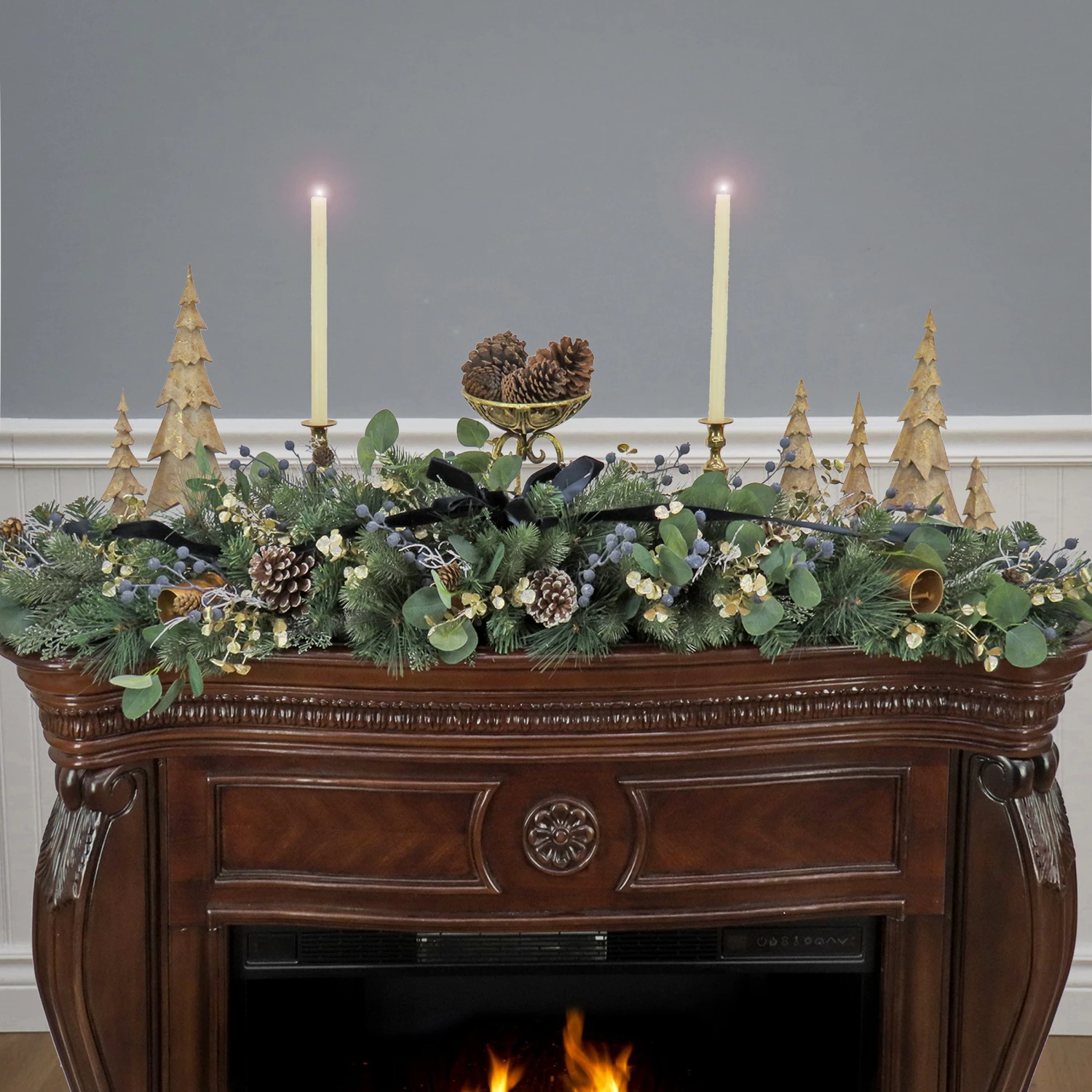- Trimmed with pinecones, berries, and bells