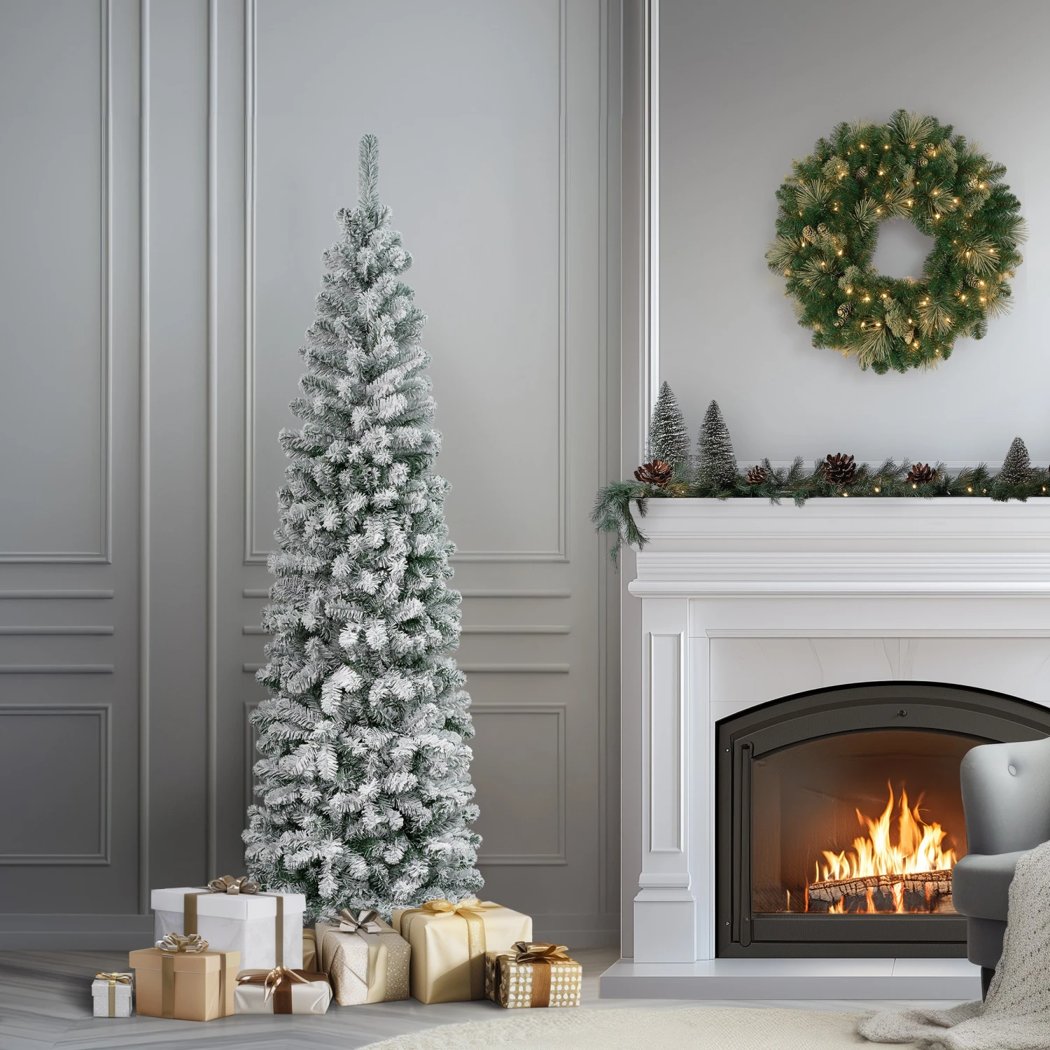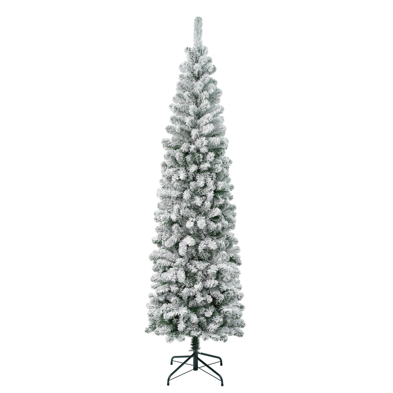 - This Acacia Pencil Slim Flocked Artificial Green Christmas Tree is 7.5 feet tall with a 26 inch base diameter. Featuring hundreds of individually crafted branch tips to create full bodied branches, this tree is designed to look and feel lifelike.