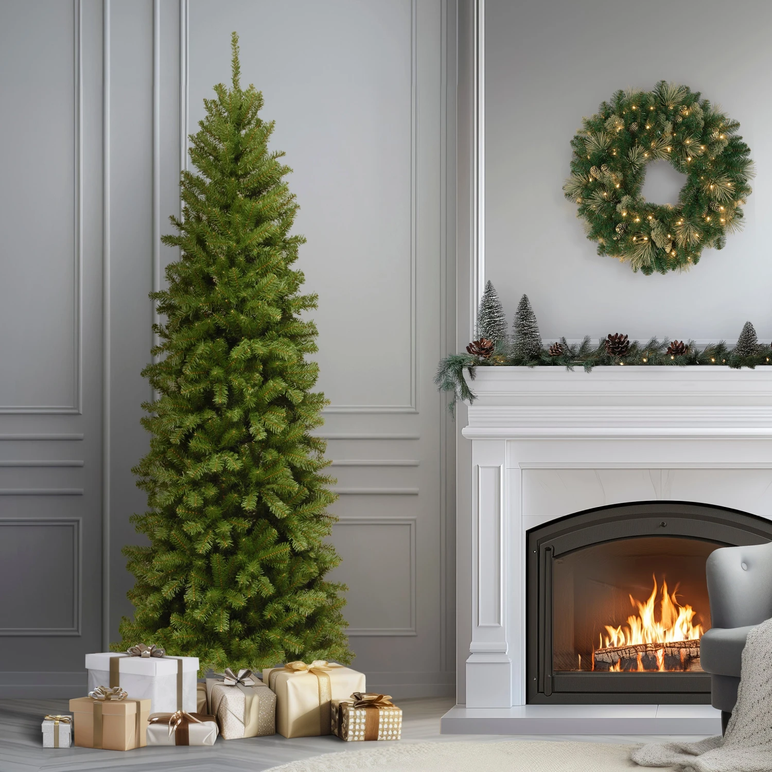 - This North Valley Spruce Slim Artificial Green Christmas Tree is 7.5 feet tall with a 32 inch base diameter. Featuring hundreds of individually crafted branch tips to create full bodied branches, this tree is designed to look and feel lifelike.