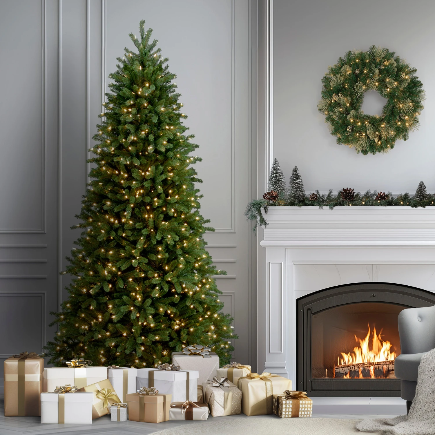 This Jersey Fraser Fir tree features Feel Real branch tip technology, creating a tree with remarkable realism. These crush-resistant branch tips are molded from real tree branches for an authentic living tree appearance. This full-bodied tree is pre-strung with 800 clear lights that remain lit even if a bulb burns out. The slim profile allows for a better fit in corners or limited space areas. This tree features hinged branch construction for ease of assembly. Sturdy metal tree stand is included.