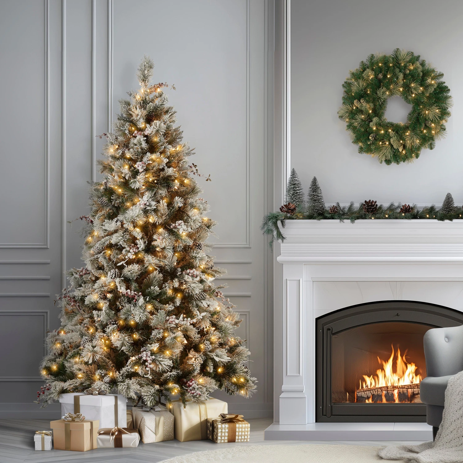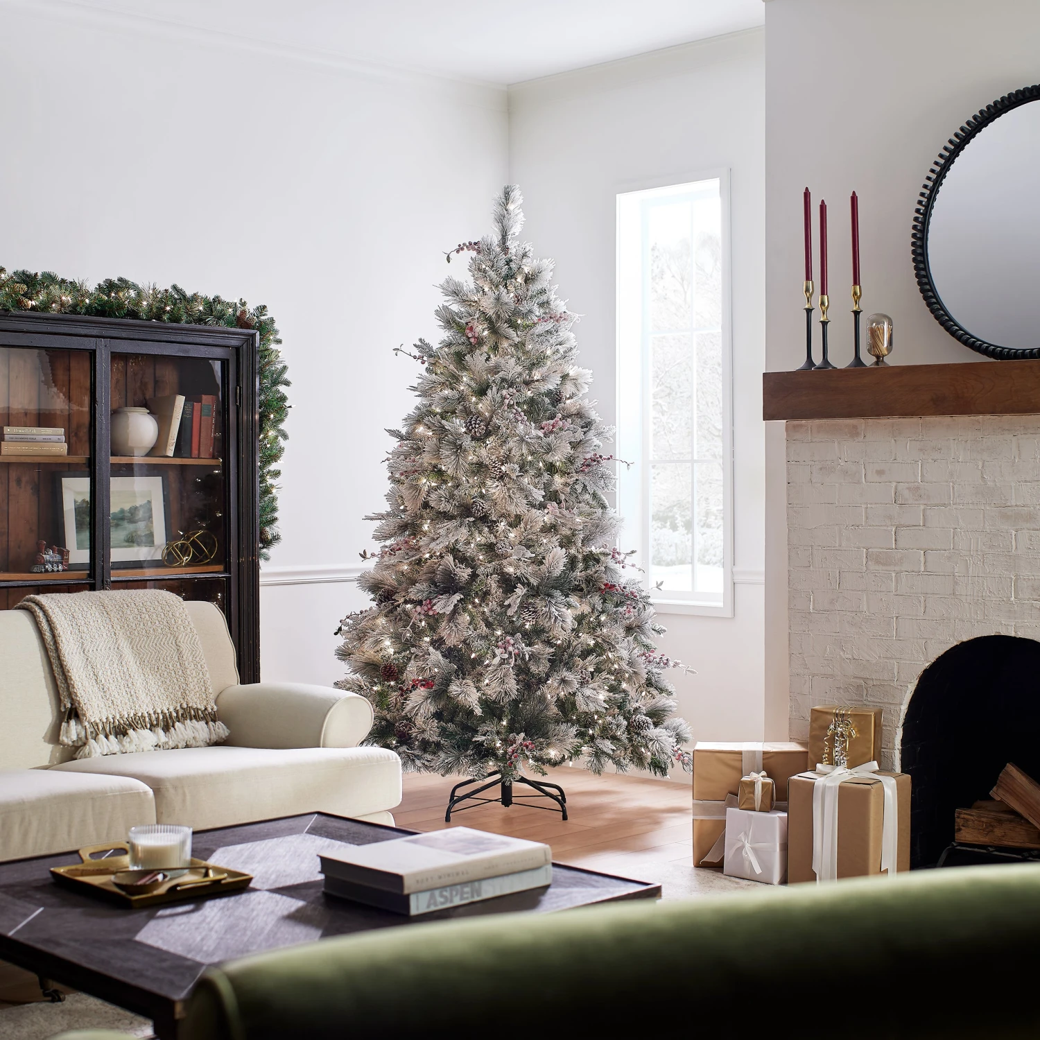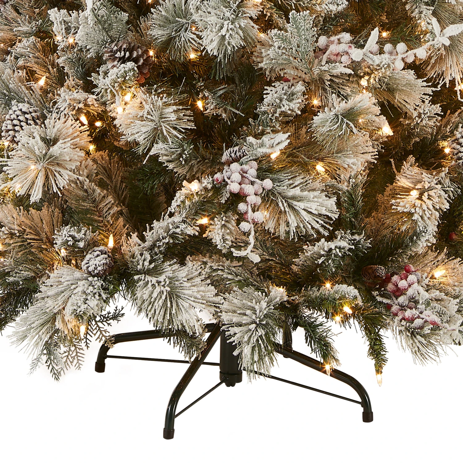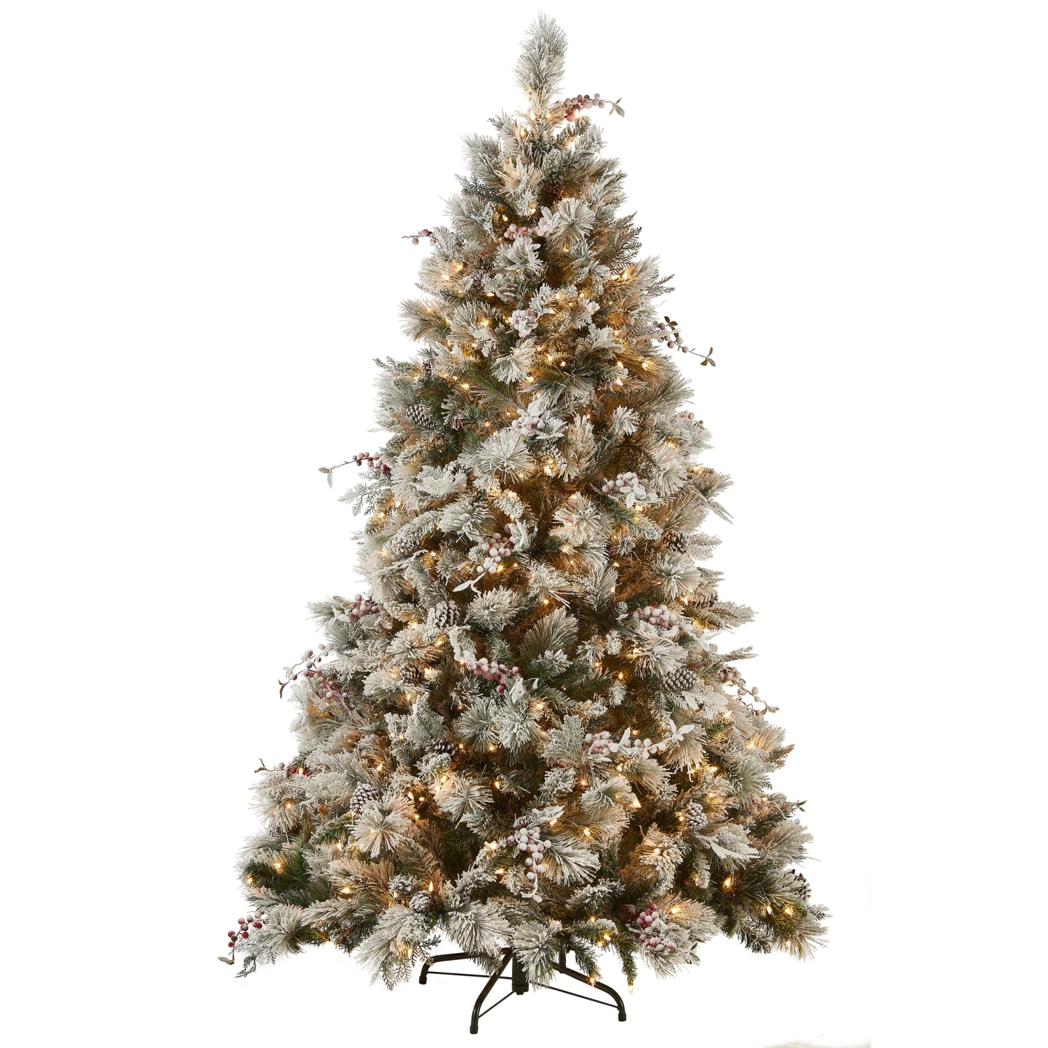 This Snowy Bedford Pine is a mixed tip tree with flocked branches giving the appearance of freshly fallen snow. It is pre-strung with 700 clear lights that remain lit even if a bulb burns out. This tree is also trimmed with red berries and pinecones for added natural appeal. This tree features hinged branch construction for ease of assembly. Sturdy metal tree stand is included.