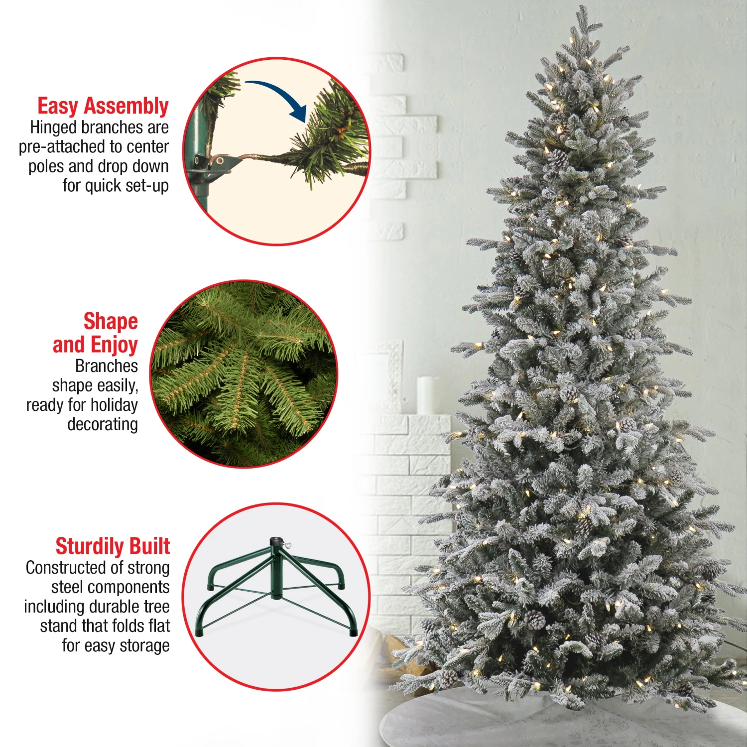 The Snowy Calton Pine tree features Feel Real branch tip technology, creating a tree with remarkable realism. These crush-resistant branch tips are molded from real tree branches for an authentic living tree appearance. This tree is trimmed with pinecones and dusted with the look of freshly fallen snow. It also offers a slim profile making it a great choice for display in corners or rooms with limited floor space. It is pre-lit with 350 warm white LED lights that are long lasting and energy efficient. This three-section tree is designed with hinged branches for ease of assembly. Sturdy folding metal tree stand is included.