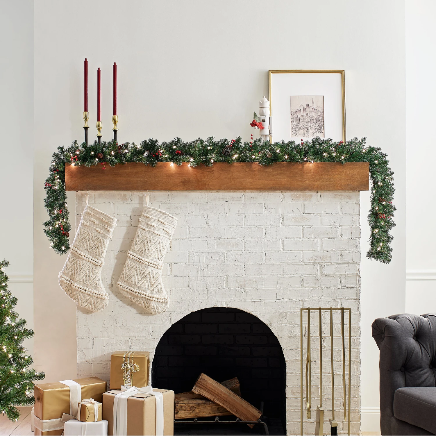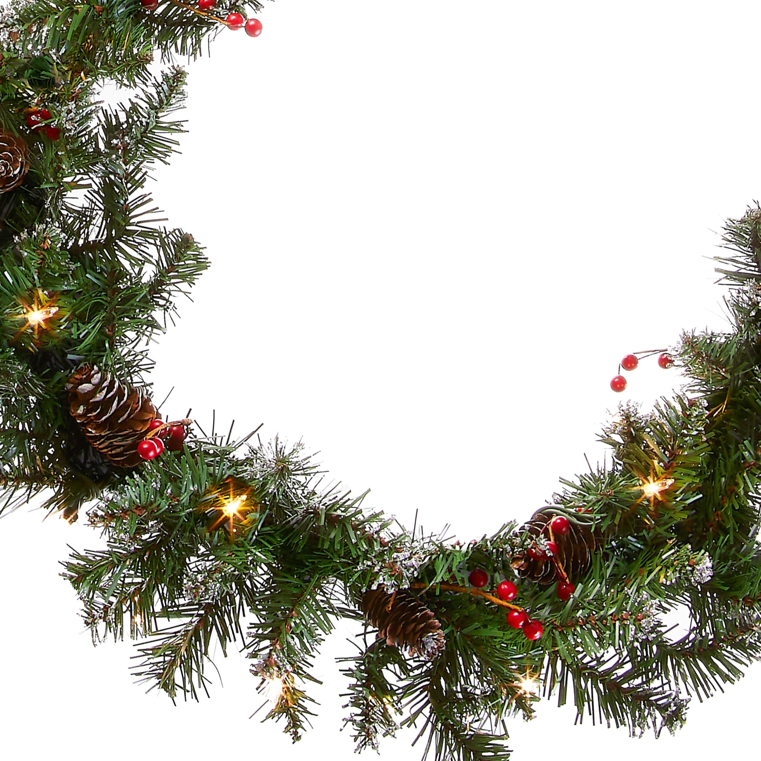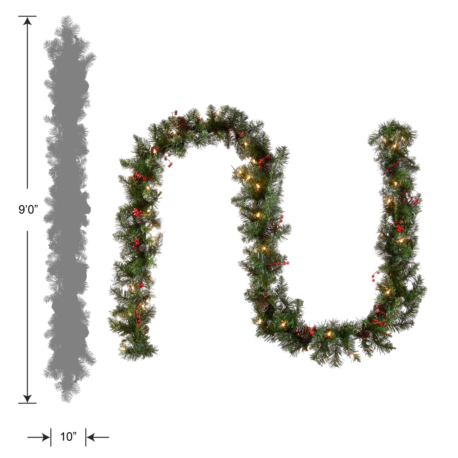 - Designed with a Glittery Mountain Spruce branch base, this pre-lit artificial Christmas garland is 9 feet long and decorated with pine cones, berry clusters and frosted branches.
