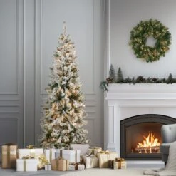 - Designed with a Bedford Pine branch base, this pre-lit artificial Christmas garland is 9 feet long and decorated with cedar leaves, berry clusters, pine cones and frosted branches.