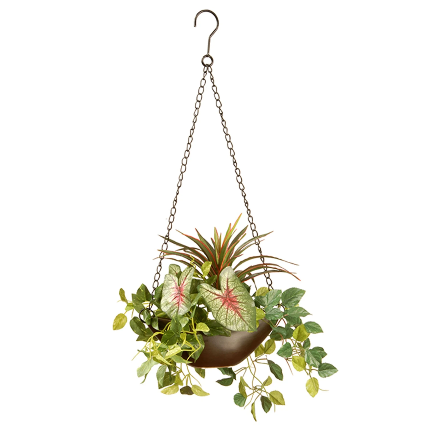 - Includes one Artificial Hanging Basket that measures 9 inches in height and includes a stylish, brown pot base and a convenient metal loop for easy hanging.