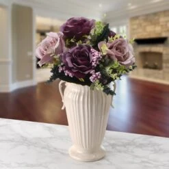 19 In. Spring Floral Bouquet With Deep Purple Rose Blooms, Pink Flowers, Seed Pods, Leafy Greens