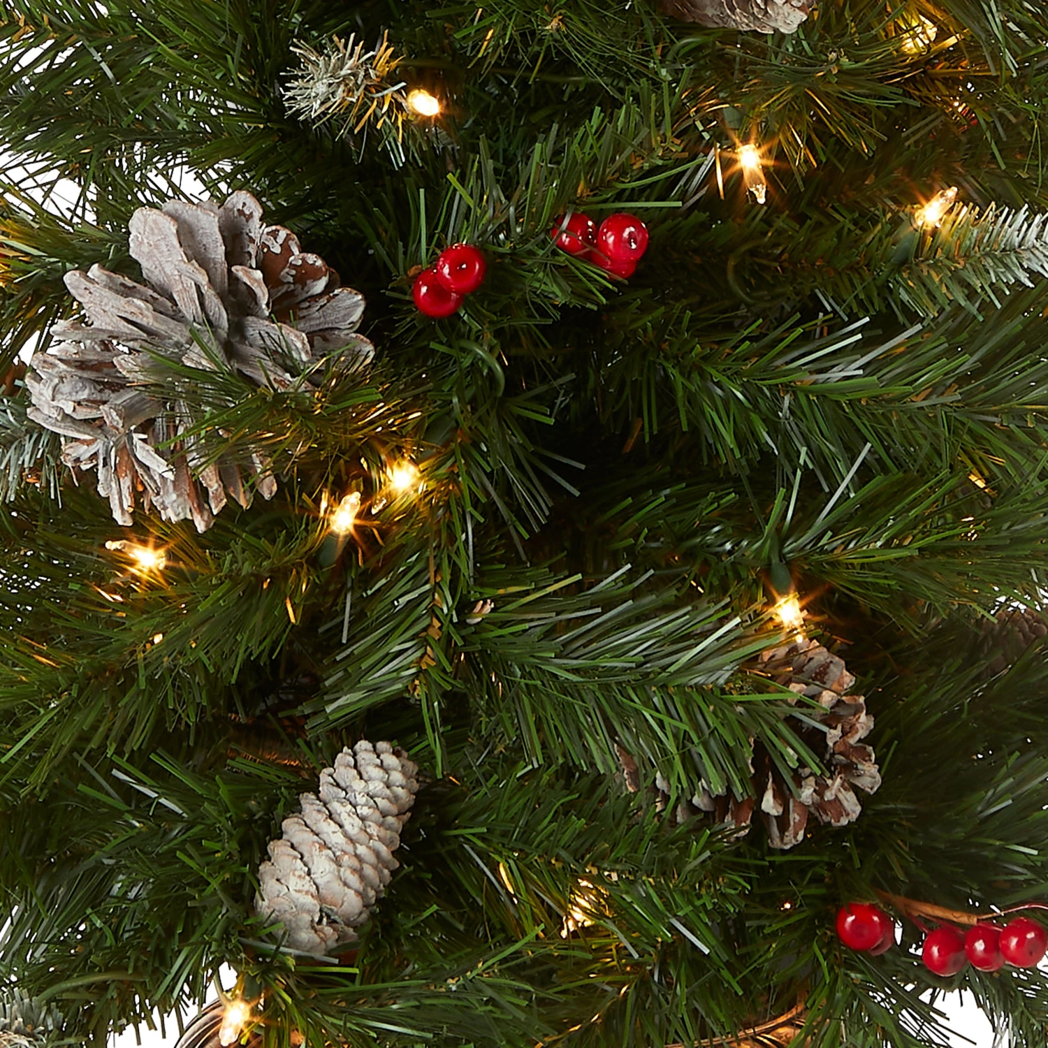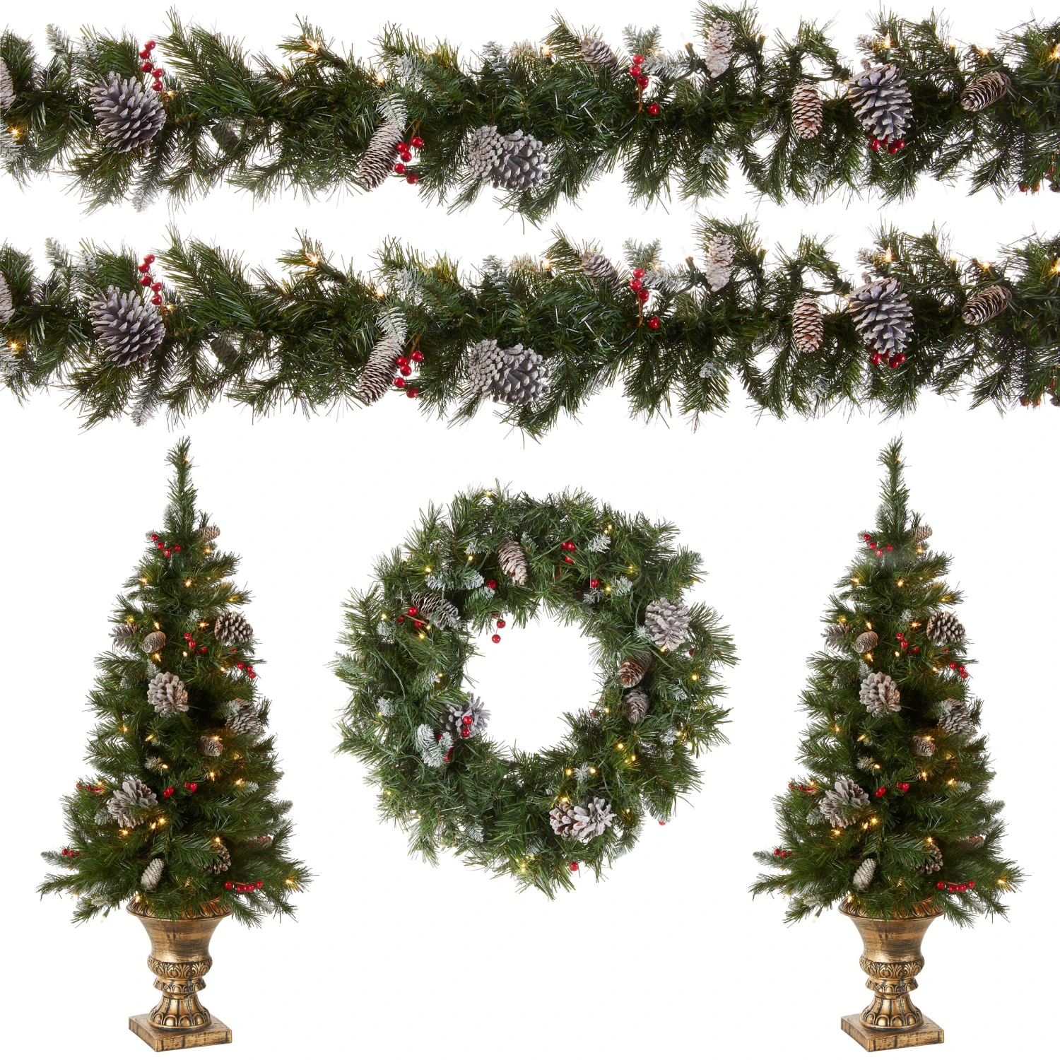 The Frosted Berry assortment features greenery items carefully selected to simplify holiday decorating by offering a package of coordinated pieces. Each item is trimmed with pine cones and has snow sprinkled branch tips. Included are two 4 ft. entrance trees each in a decorative urn base and pre-lit with 70 clear lights, perfect for doorways or hallways. Also included is a 24″ wreath pre-lit with 50 battery operated warm white LED lights, and two 9 ft. garlands each pre-lit with 50 clear lights. The battery operated wreath includes an integrated 6 hours ON/18 hours OFF timer. Both trees and garlands are plug-in items, only wreath is battery operated. All pieces are for indoor or outdoor use.