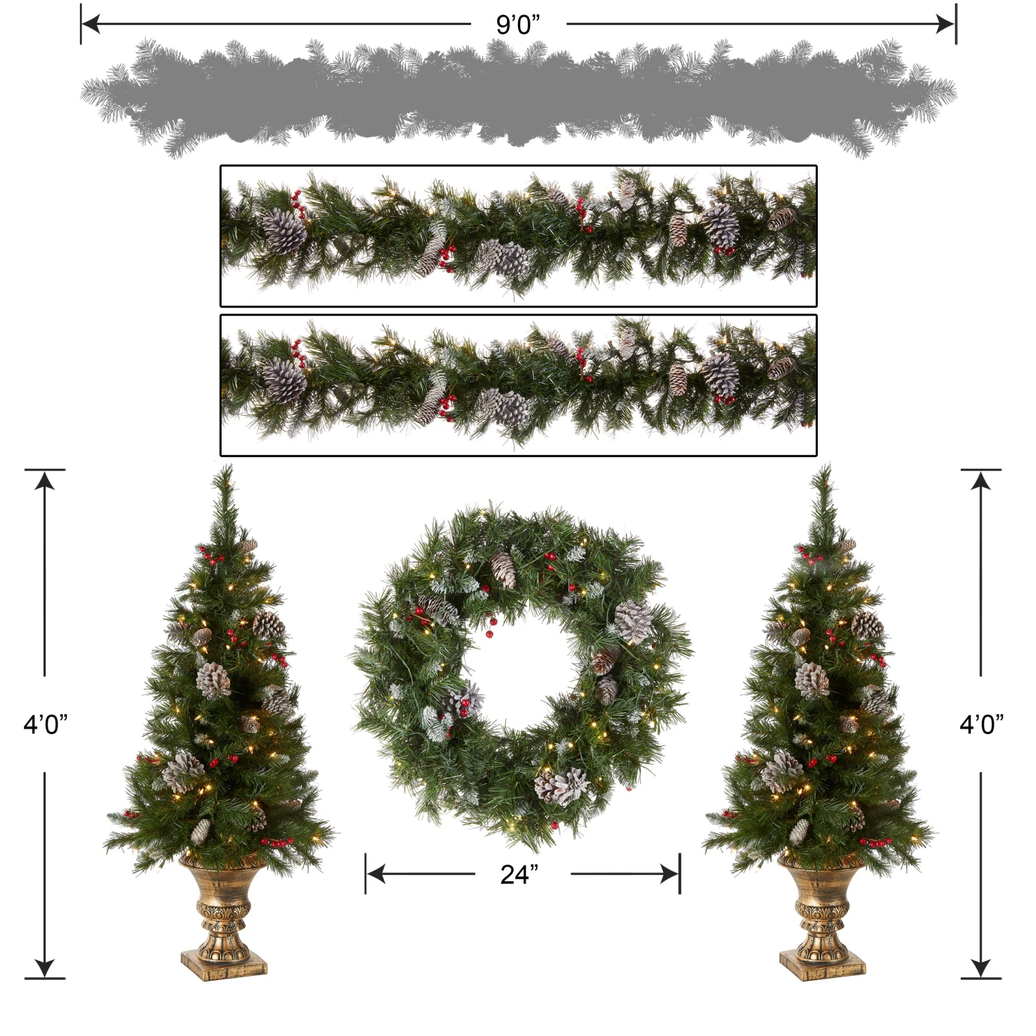 - This Frosted Berry Pre-Lit Artificial Assortment comes with 2 Entrance Trees, 4 feet tall with a 24 inch base diameter. 2 Garland, 9 feet in length, and 1 Wreath 24 inch diamater. Featuring hundreds of individually crafted branch tips to create full bodied branches, this tree is designed to look and feel lifelike.