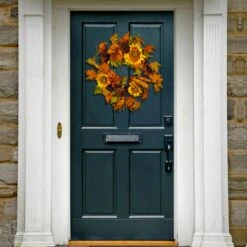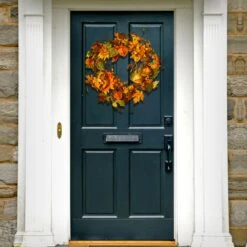 24 In. Pre-Lit Fall Wreath With Gourds, Pinecones, Maple Leaves, Berry Clusters And Lights
