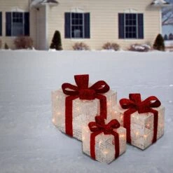 Pre-Lit Red And White Gift Boxes, Set Of Three, White Lights