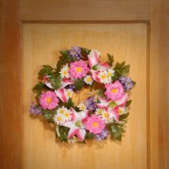 18 In. Spring Wreath With Pink And Green Assorted Wood Cut Flowers, Flowing Green Leaves