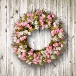 21 In. Spring Wreath With Pink And White Tulips, Flowing Green Stems