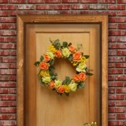 20 In. Spring Wreath With Yellow And Orange Rose Blooms, Seed Pods, Berry Clusters, Leafy Greens