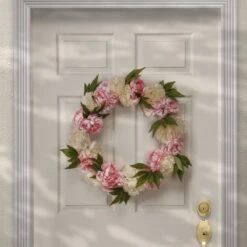 24 In. Spring Wreath With Pink And White Peony Blooms, Leafy Greens