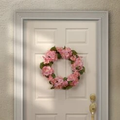 24 In. Spring Wreath With Pink Hydrangea Blooms, Berry Clusters, Leafy Greens